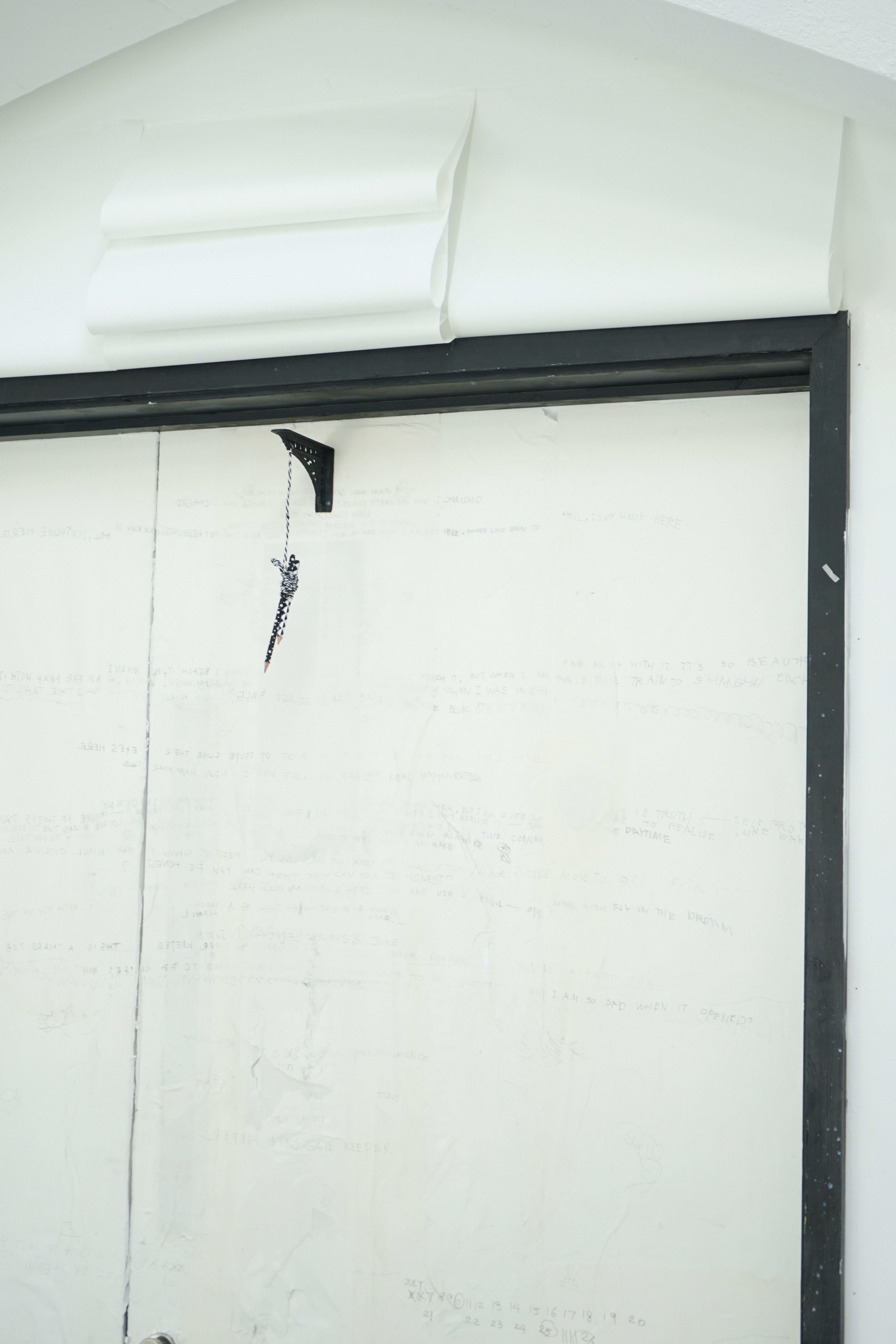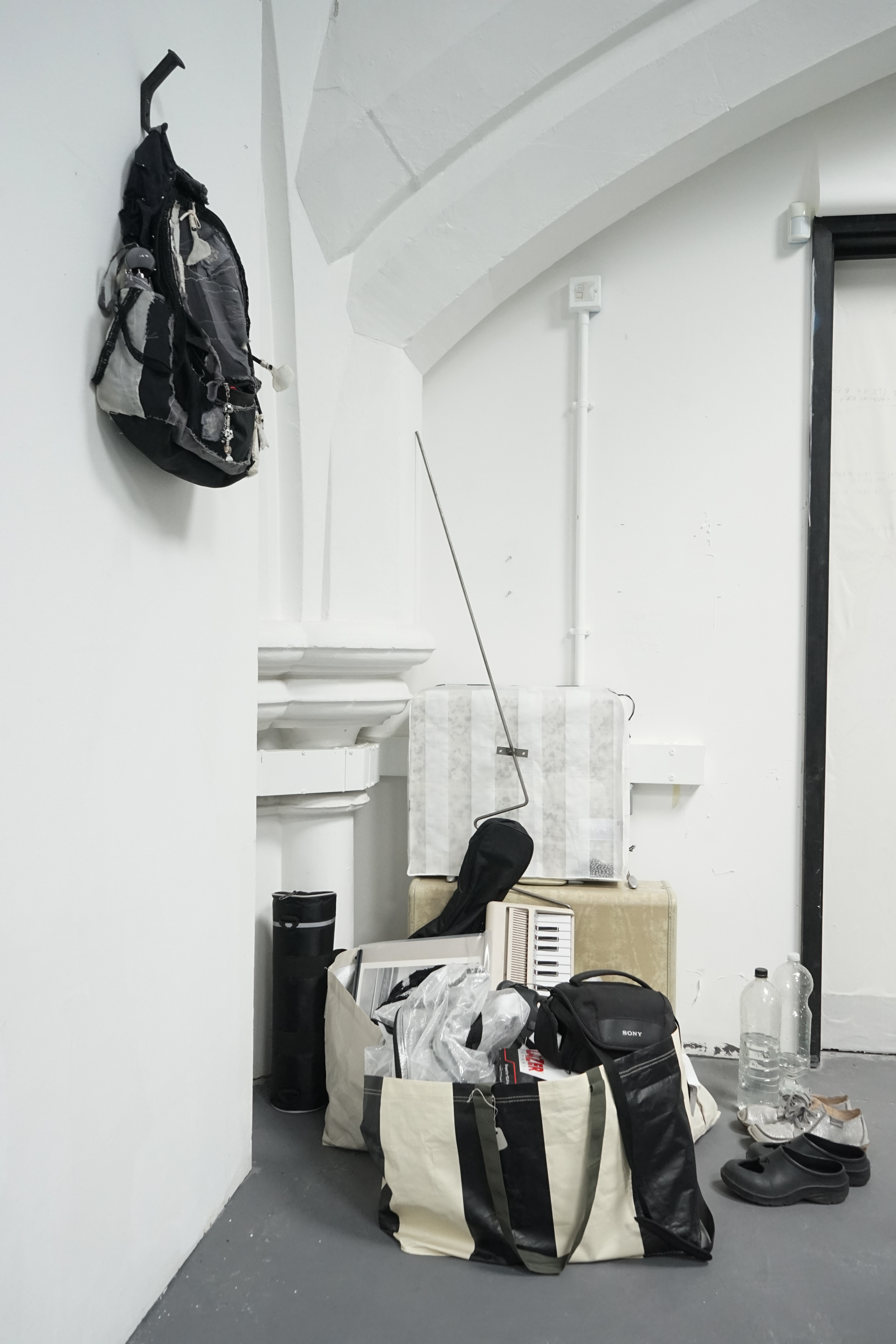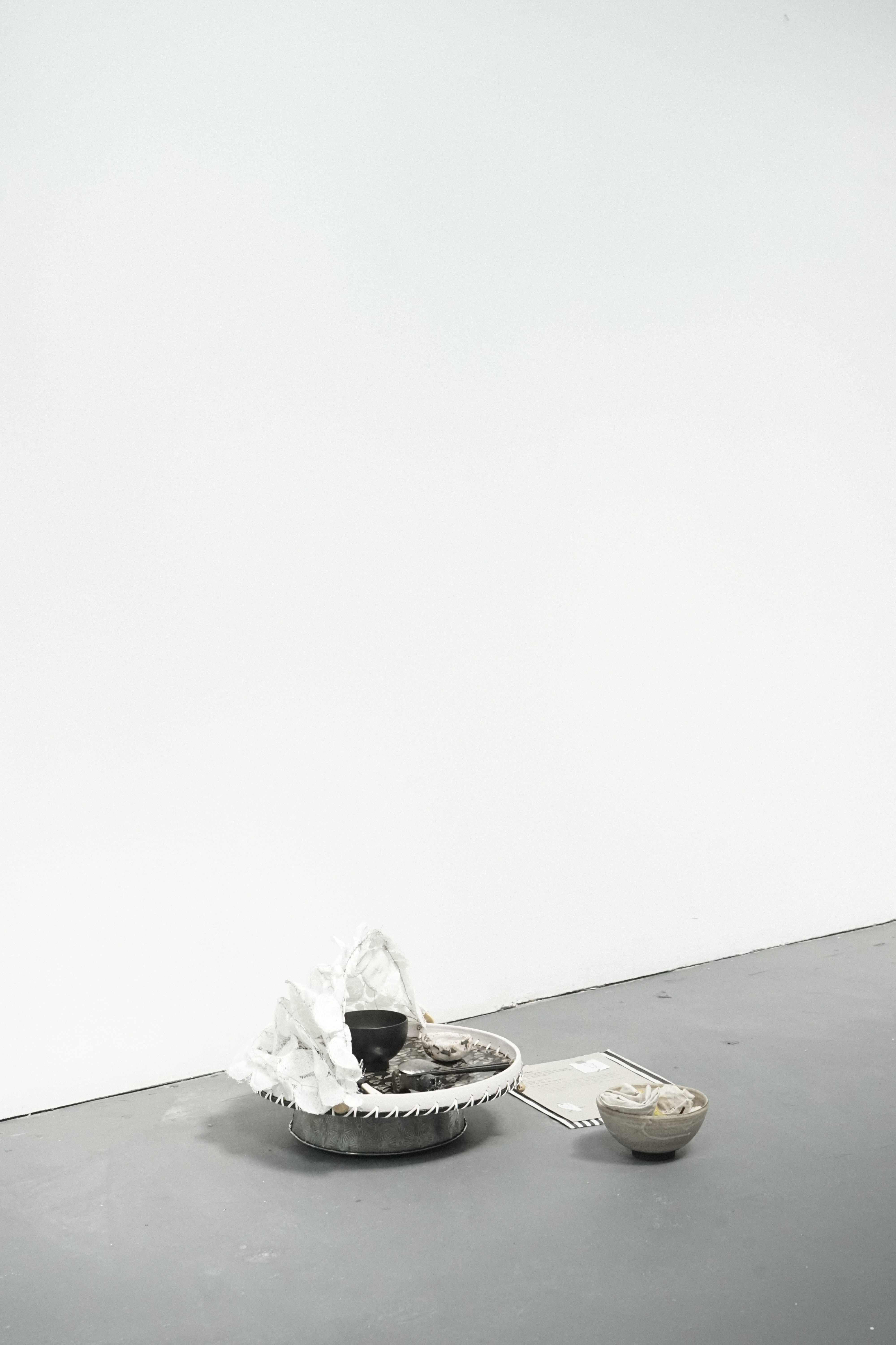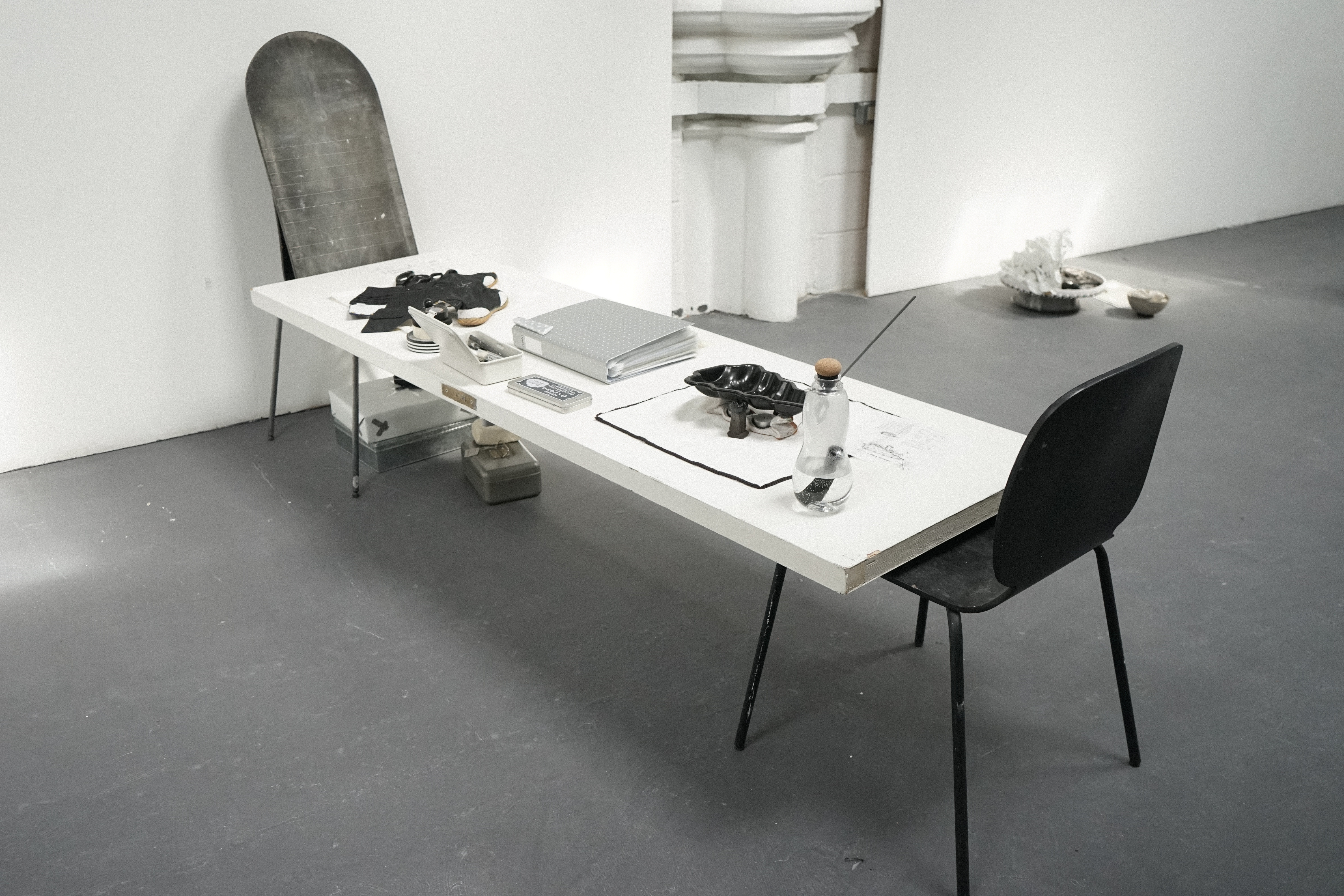 Found chair, found door, water bottle, cotton, tin box, ceramic, candle, lighter, paper, stick, tools, tapes, nails, tabi shoes, scissors, manuscript, packaging box, sponge wipe