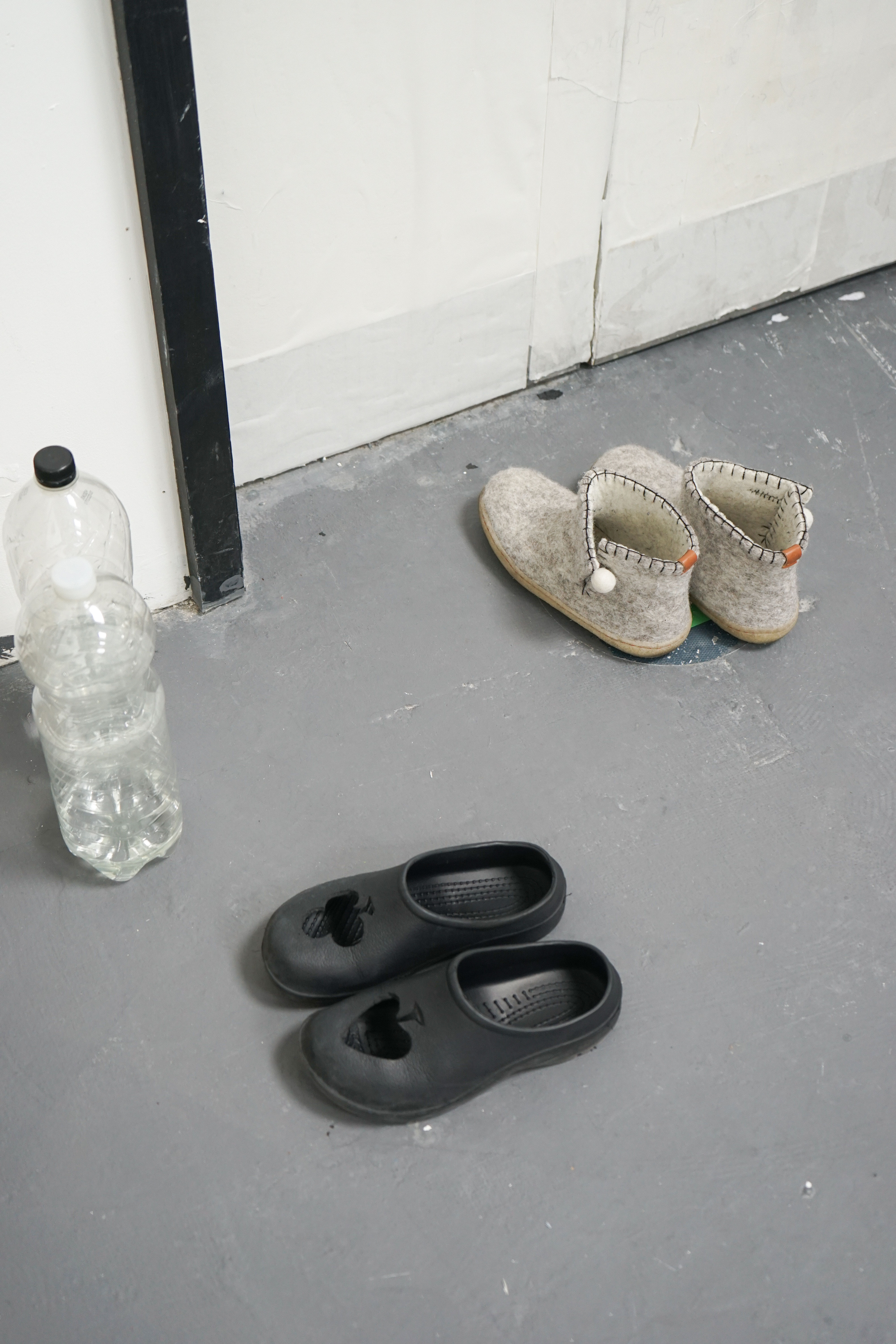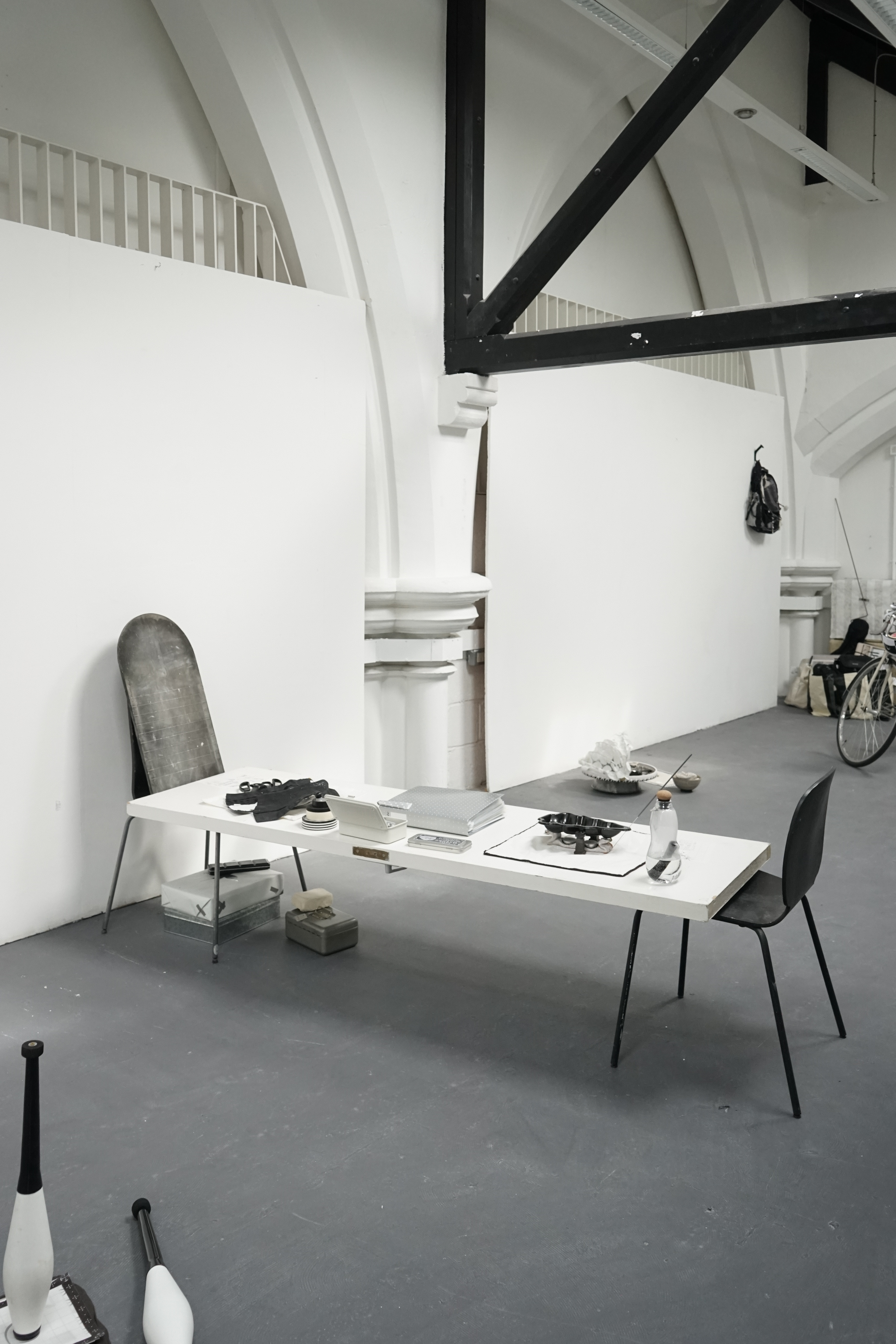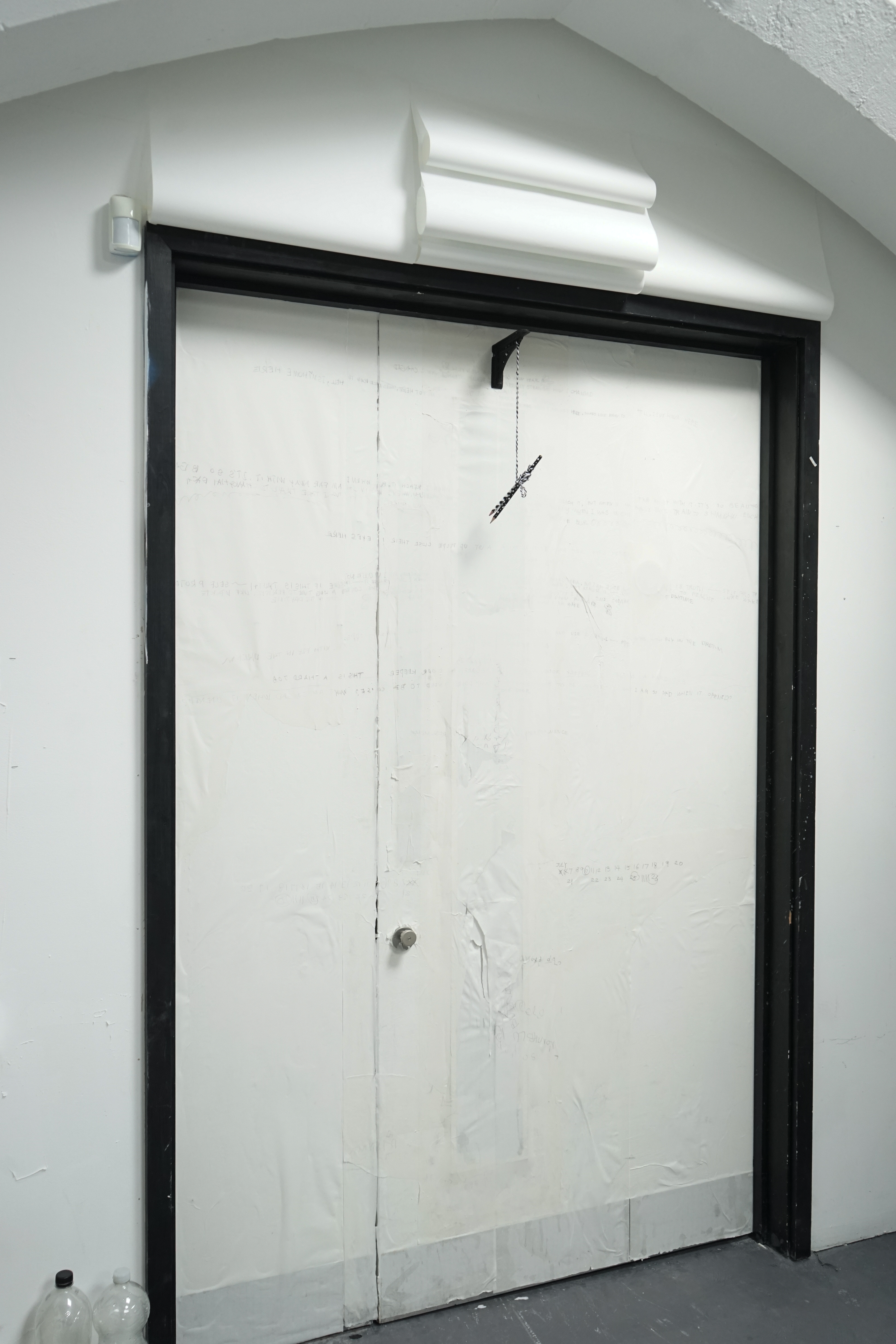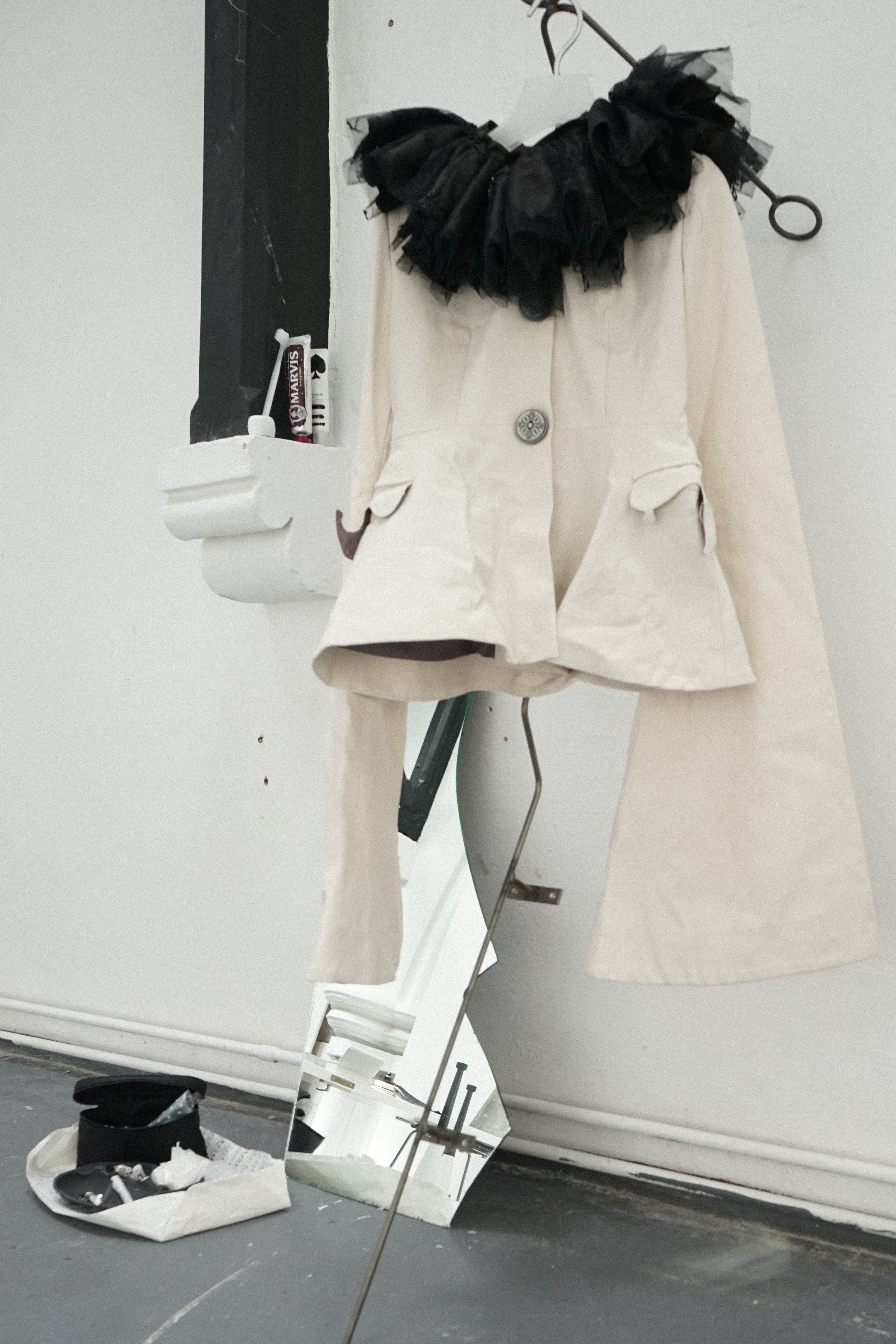 Found chair, found door, water bottle, cotton, tin box, ceramic, candle, lighter, paper, stick, tools, tapes, nails, tabi shoes, scissors, manuscript, packaging box, sponge wipe