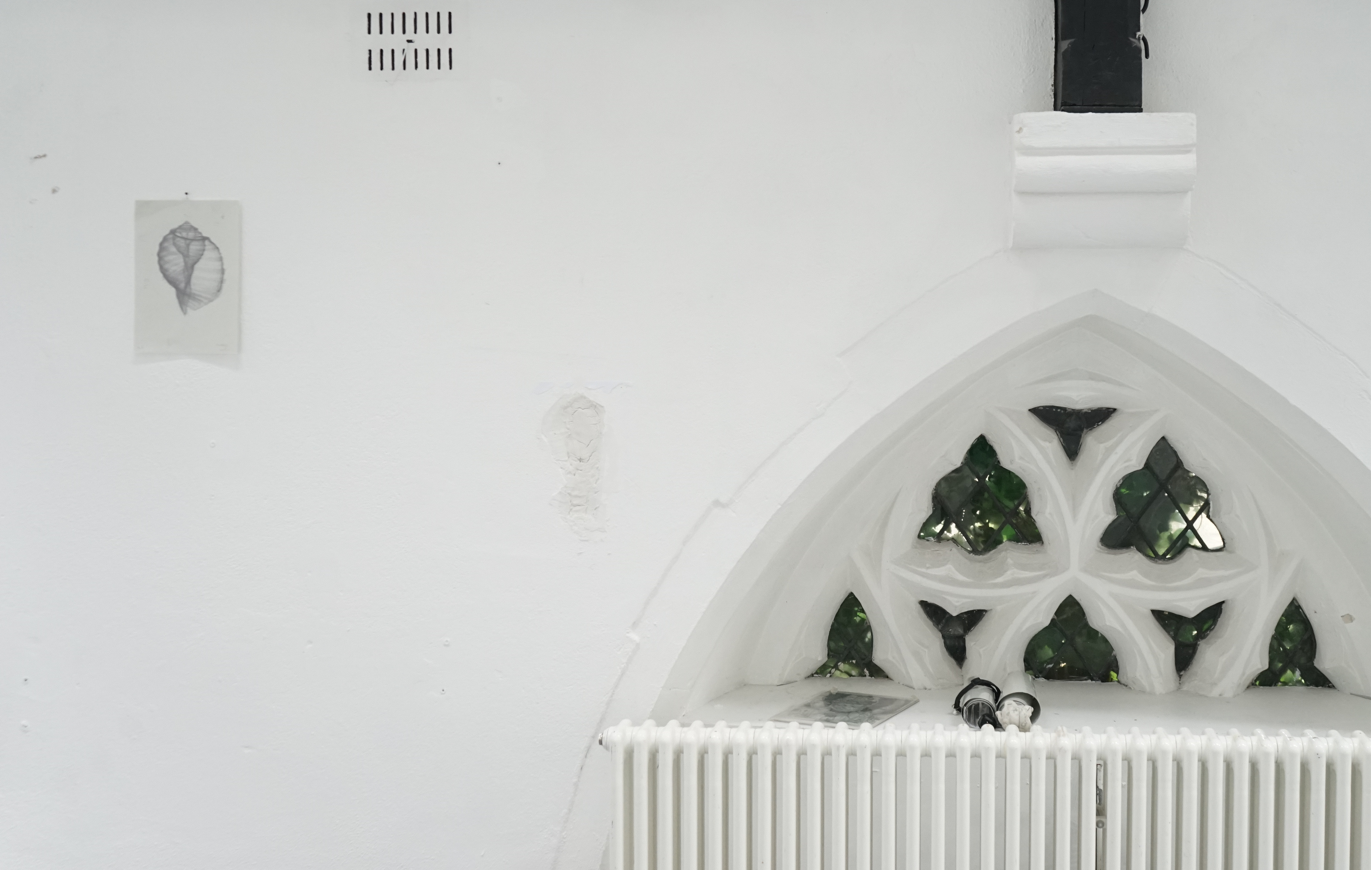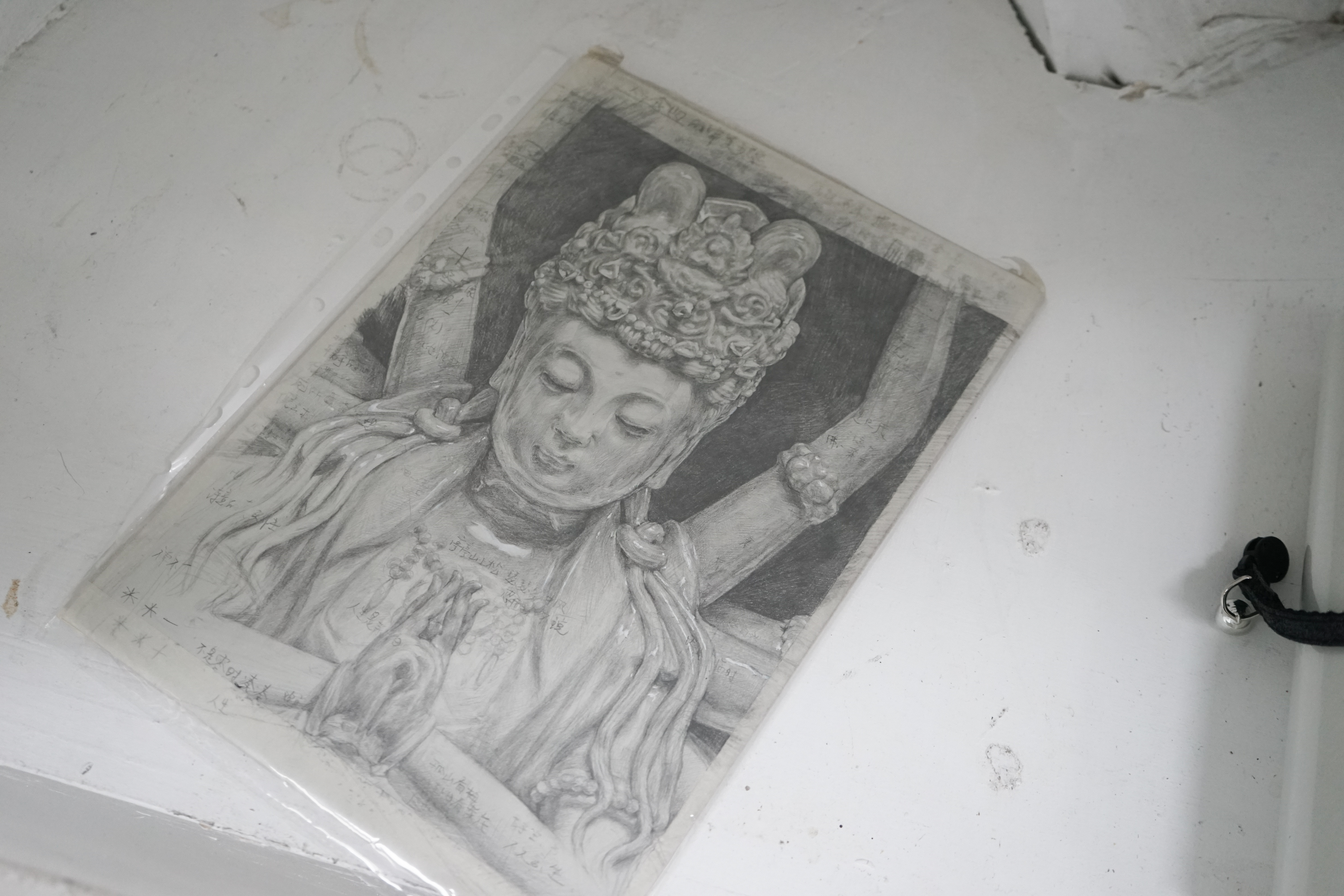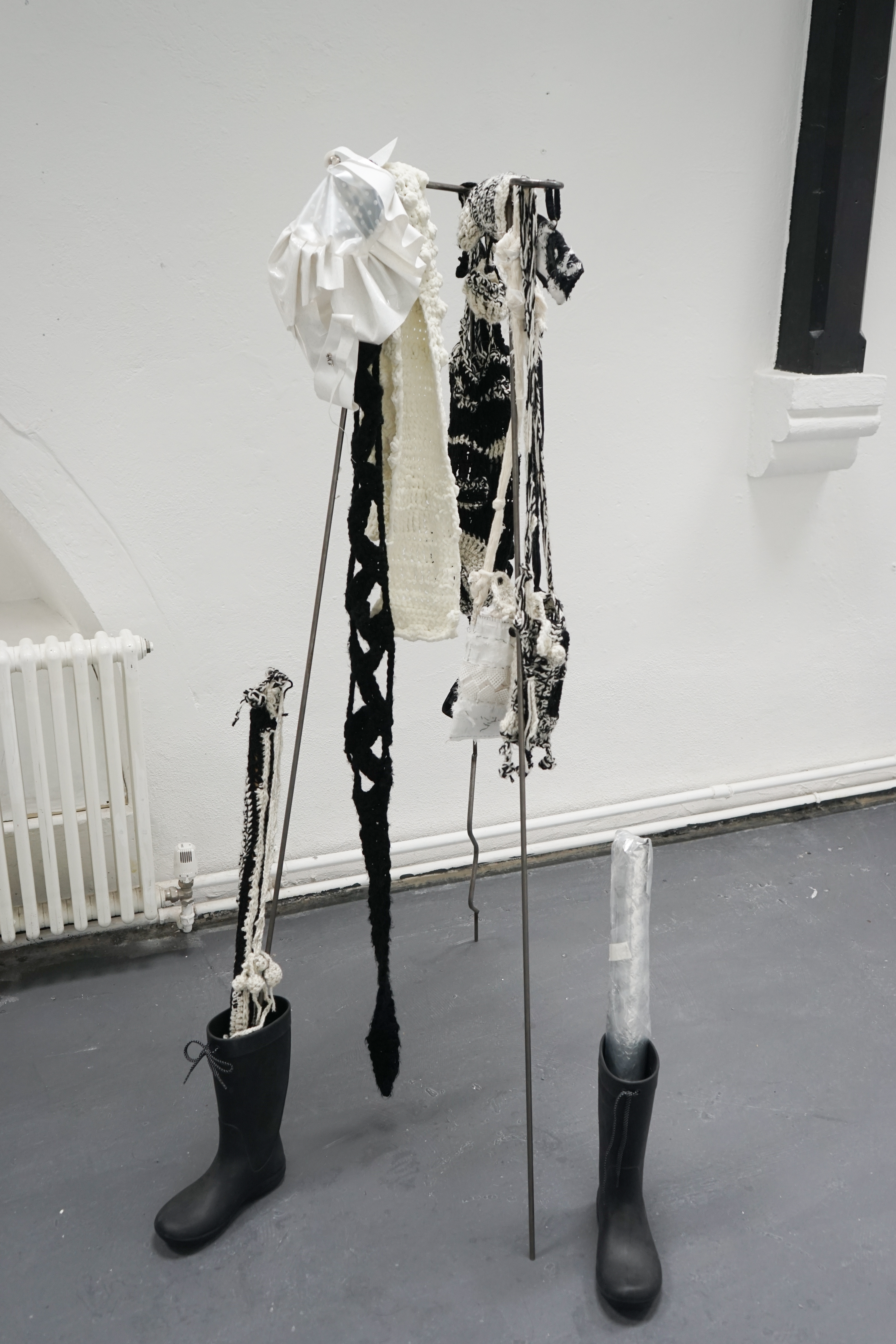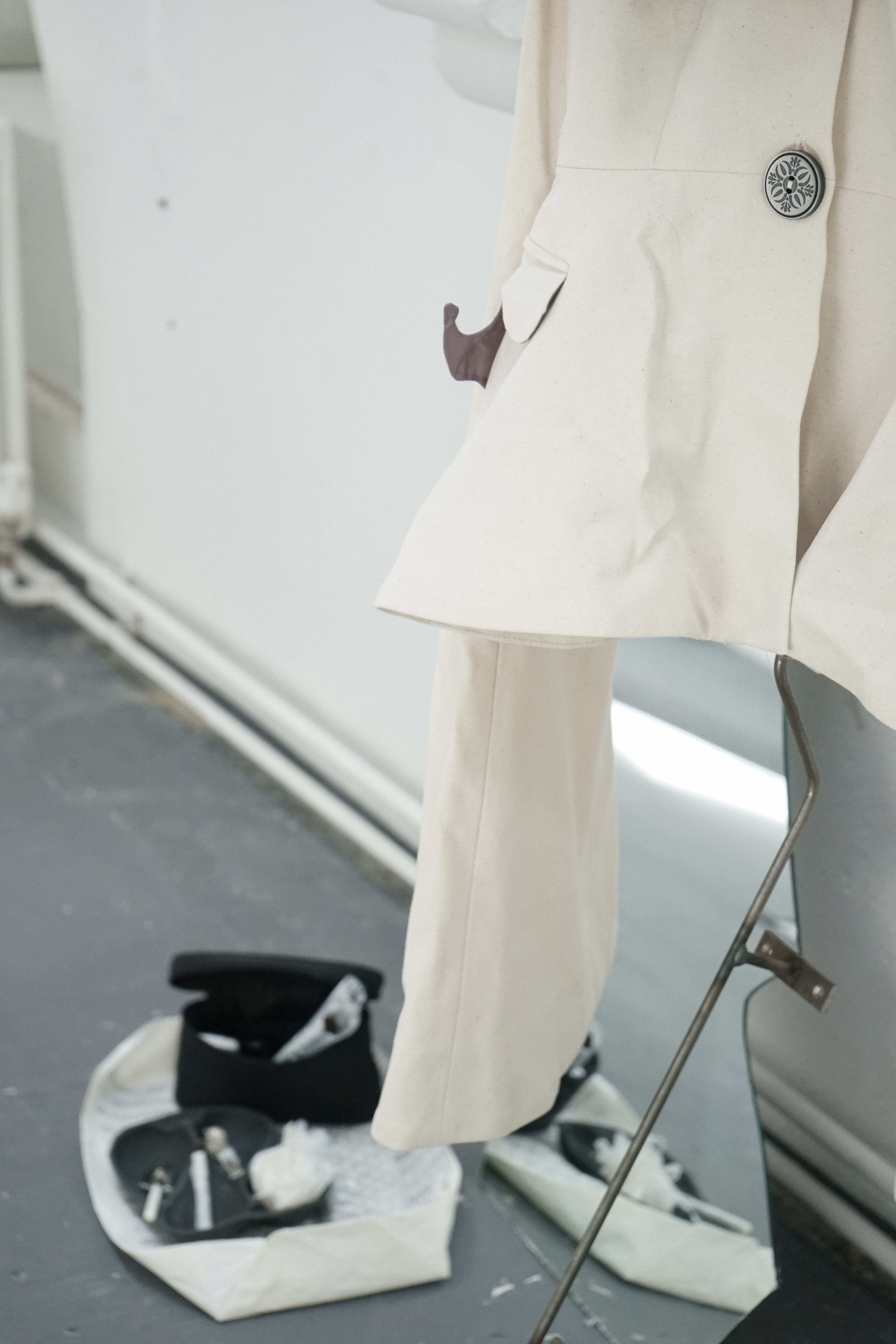 Found chair, found door, water bottle, cotton, tin box, ceramic, candle, lighter, paper, stick, tools, tapes, nails, tabi shoes, scissors, manuscript, packaging box, sponge wipe