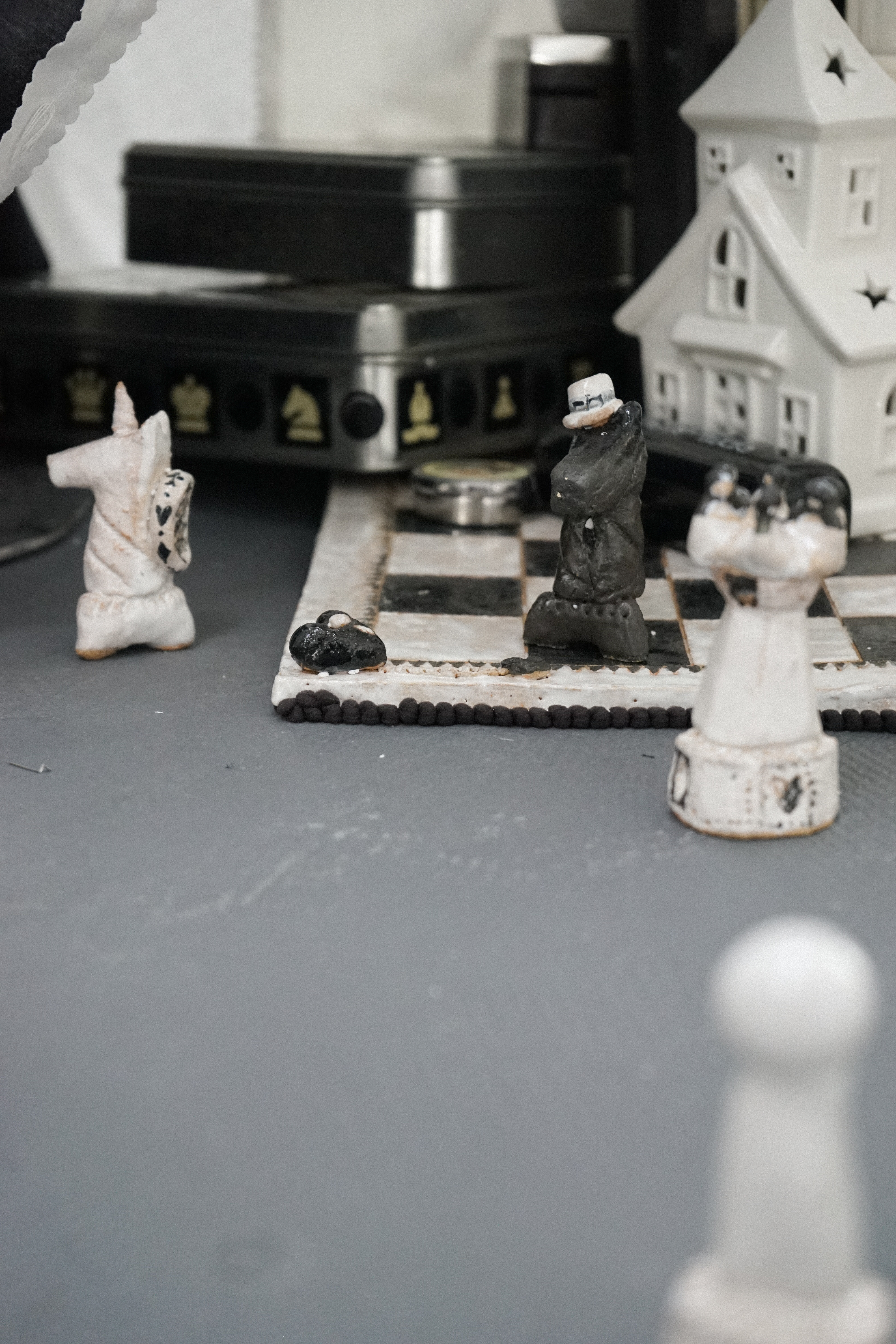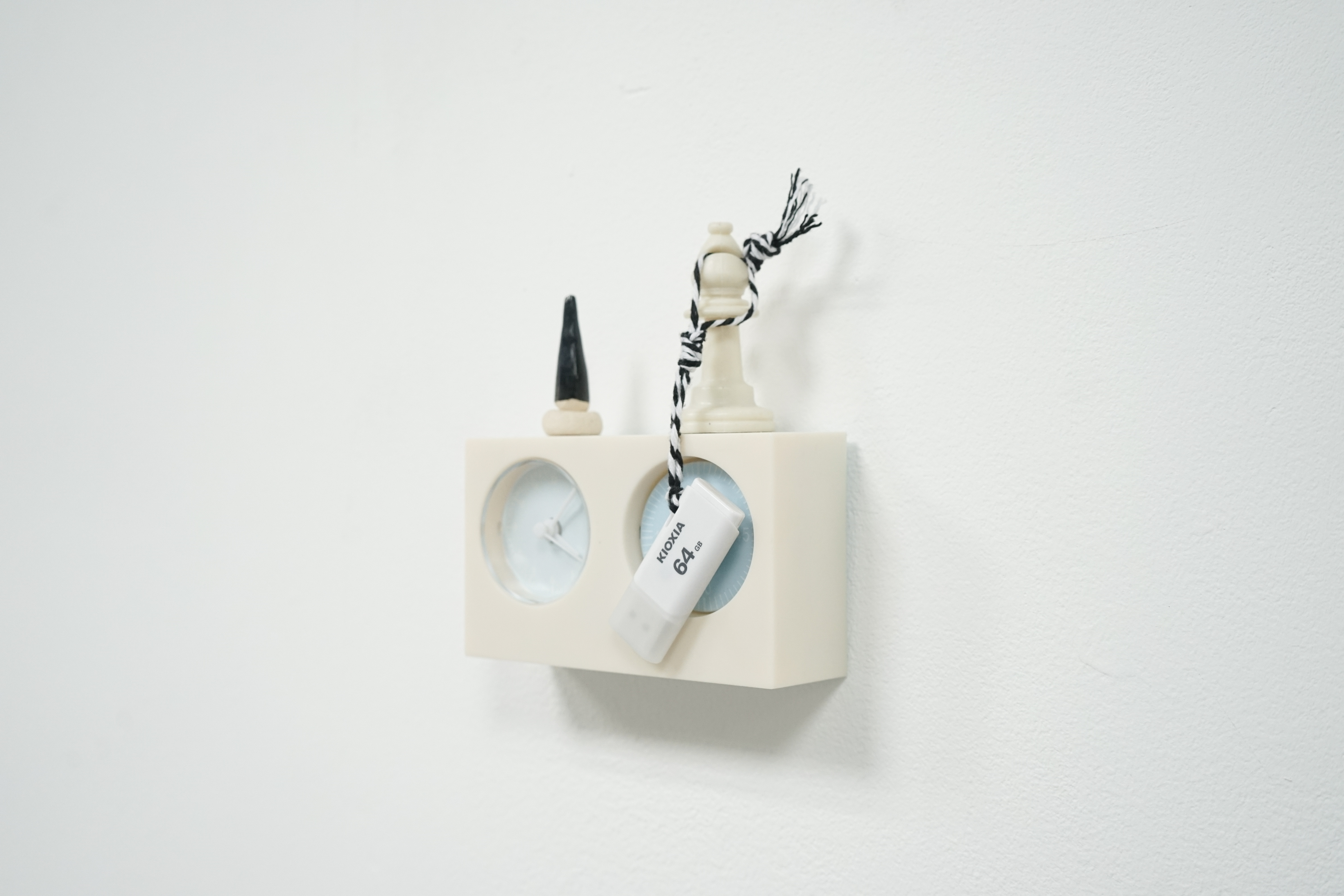 Alarm clock, plastic chess pieces, USB flash drive, ceramic