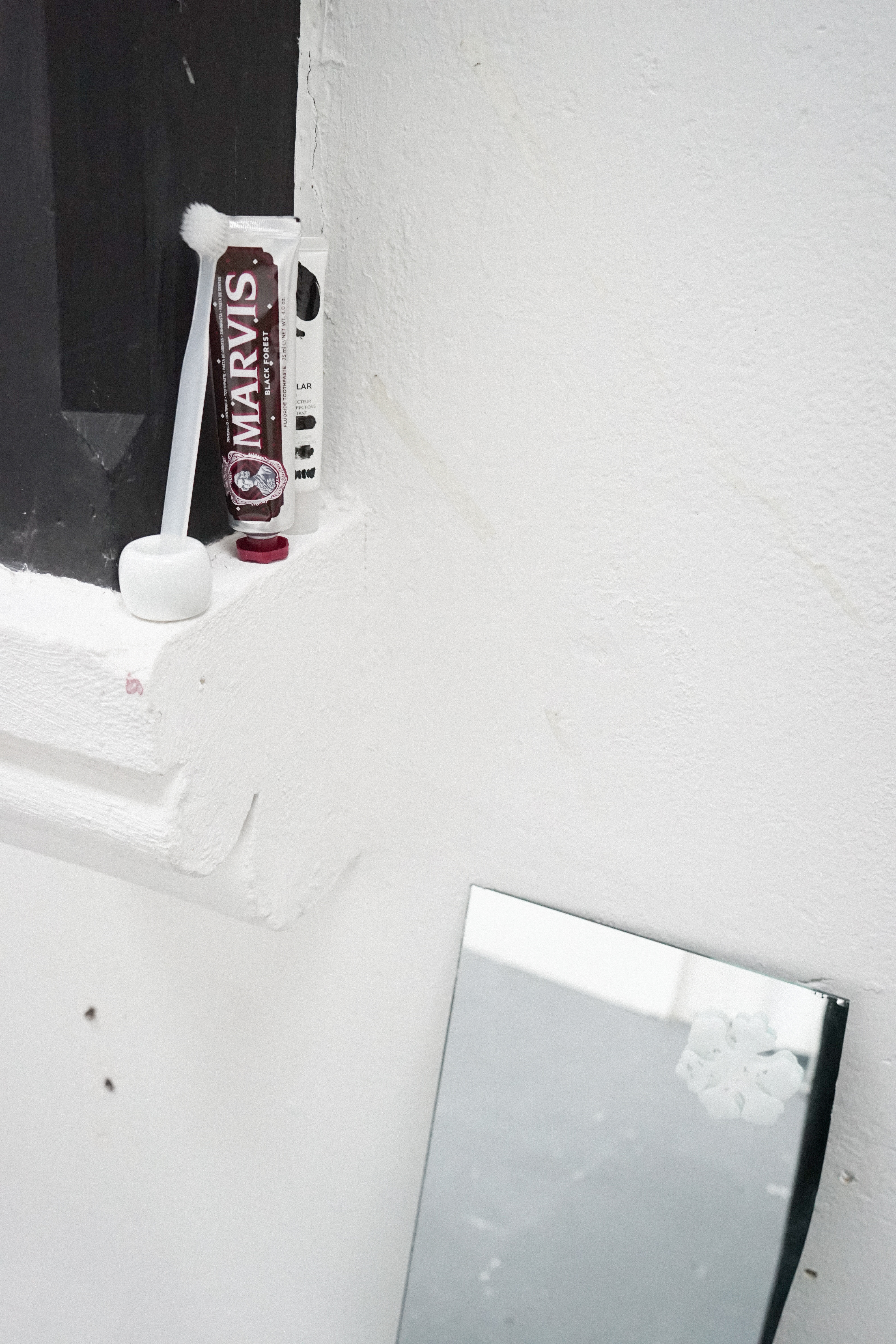 Toothbrush, toothpaste, moisturiser, make-up bag, paper, mirror, silicone, eyeshadow case, soap, clip, nail clipper, make-up brush, uniform, metal stand