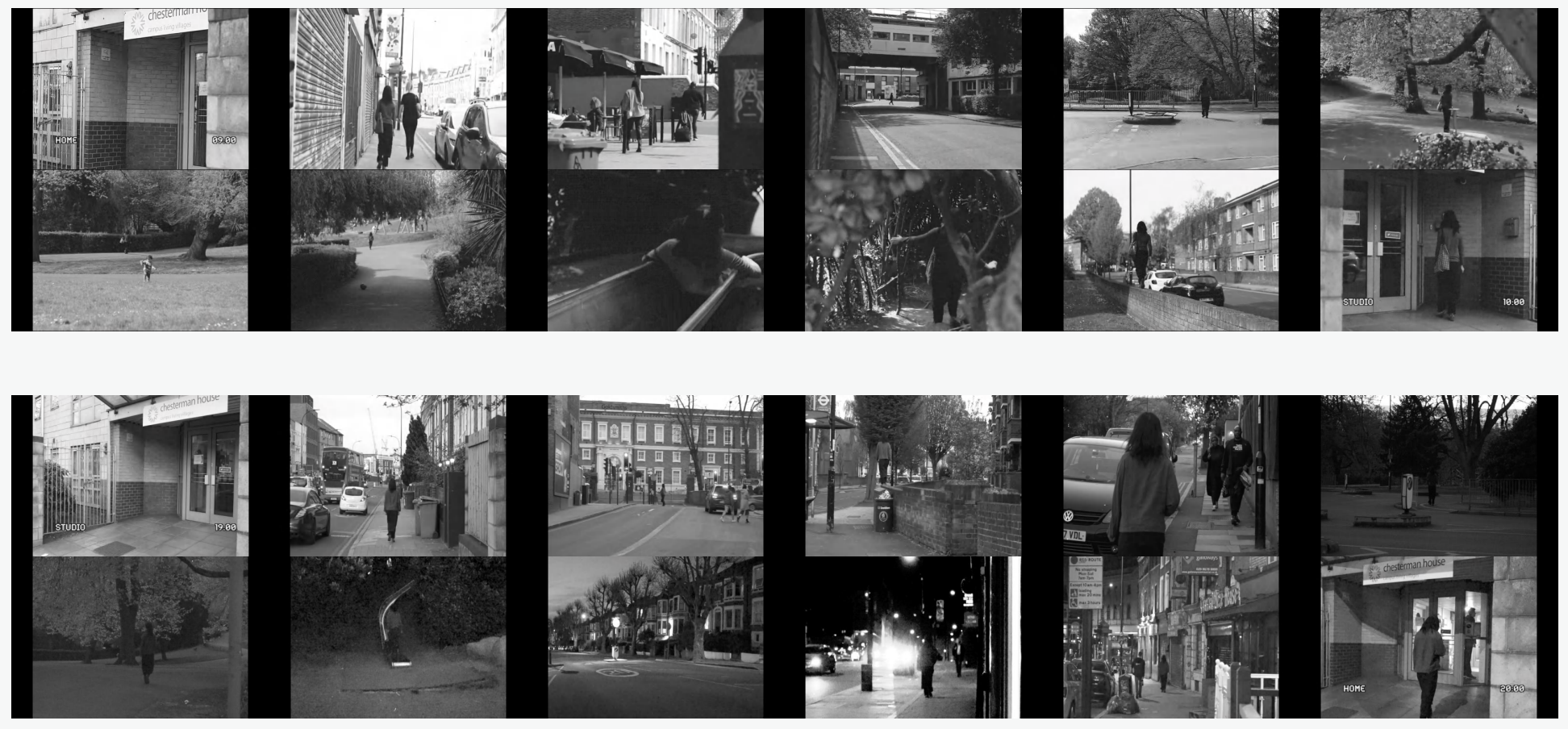 家和工作室是同一个地方。休闲与劳动之间的转换,通过一个仪式性的“触发器”来切换:清晨,从“家”出发,顺时针绕街区一圈,回到原点,把这里变成 “工作室”;傍晚,逆时针绕行回来,又从“工作室”回到“家”。这组双频影像记录了两段日常的步行路线。重复的路径中,空间的意义随着行走的方向转 换。这是一种心理地理学的仪式,空间不必移动,但意识已经抵达另一个地方。